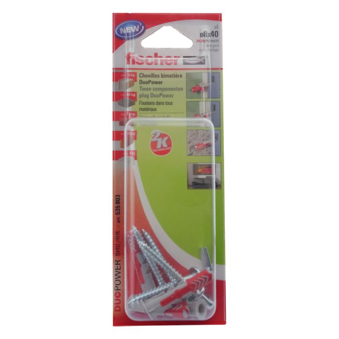 La cheville fischer DuoPower est une chevile intelligente bi-matière dotée de trois fonctions. La cheville DuoPower convient à la fixation dans tous les matériaux de construction. Cela permet une variété d'applications avec une seule cheville. La cheville fischer DuoPower s’adapte automatiquement au matériau de construction et permet des charges élevées grâce aux trois principes de fonctionnement du produit : s'expanse, se déploie, forme un noeud. Le vissage facile de la vis et la bonne perception du couple de blocage crée un avantage supplémentaire en matière de sécurité.