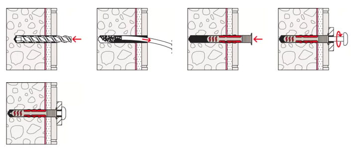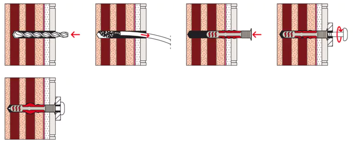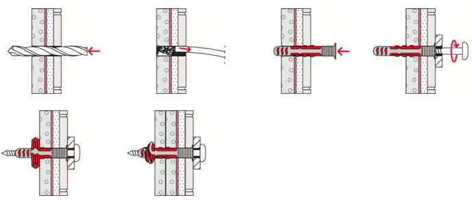 3. Le composant rouge en nylon de haute qualité s'adapte automatiquement au support (s'expanse, se déploie, forme un noeud) qu'il soit plein, creux ou en plaque.