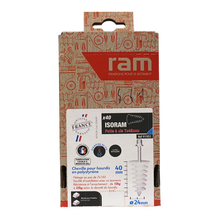 40 chevilles Ø24 x 40 mm ISORAM avec 40 pattes à vis 7 x 45 - Ram