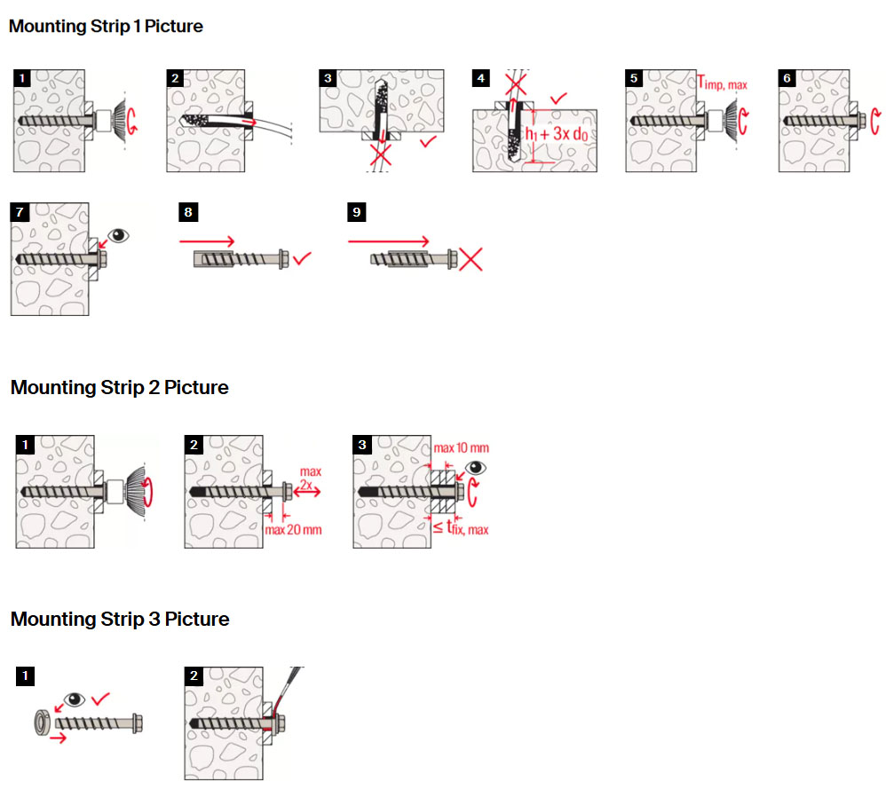 • Pas de nettoyage du forage nécessaire en cas d'installation au plafond ou sous conditions au sol ou en cas d'utilisation d'un foret à percussion aspirant. Pour les fixations au sol, la profondeur de perçage doit être augmentée de 3x le diamètre de perçage.