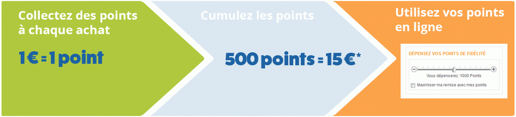 Grâce à notre programme de fidélité, pour chaque euro d’achat, vous gagnerez un point. A compter de 500 points, bénéficiez de 15€ de remise sur votre nouvelle commande. Suivez vos informations au jour le jour grâce à votre compte client ! Et n’oubliez pas, vous bénéficiez aussi du service de double-livraison. Toutes les informations sont disponibles sur cette page.