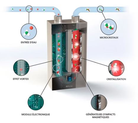 L'anticalcaire magnétique protège vos installations contre la formation de calcaire en utilisant une technologie qui combine un impact électro-magnétique (EMI), un effet vortex et des zones entrelacées.