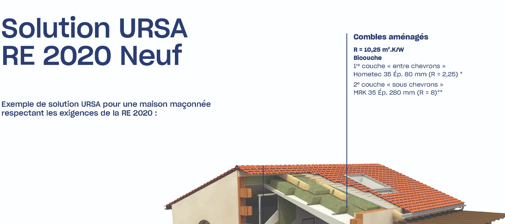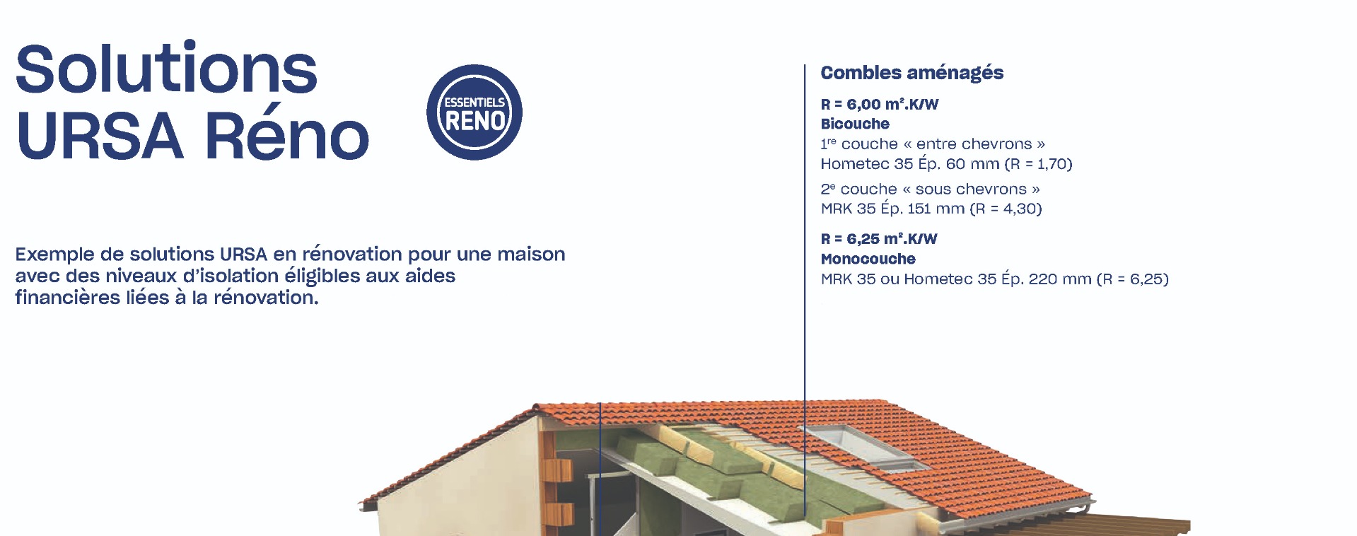 Nous vous proposons trois solutions pour l'isolation de vos combles aménagés, selon le niveau de coefficient thermique souhaité, ainsi que deux types de laines de verre : gamme URSA TERRA.