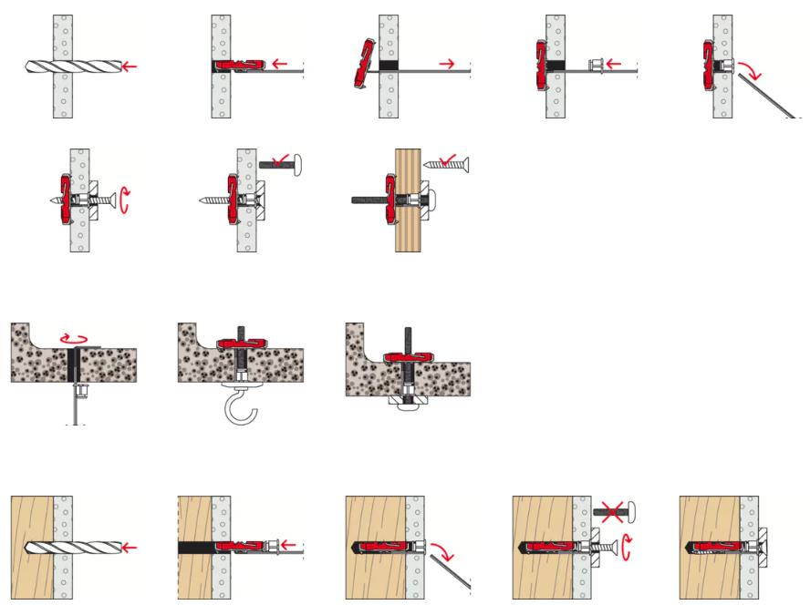 • Perçage standard de petit diamètre et la petite taille de la cheville à bascule (39 mm) simplifient l’installation, même dans les cavités étroites et isolées