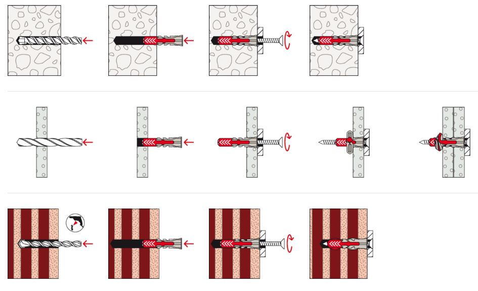 1. Cheville bimatière pour de meilleures performances et un fonctionnement ingénieux (s'expanse, se déploie, forme un noeud), en fonction du support.