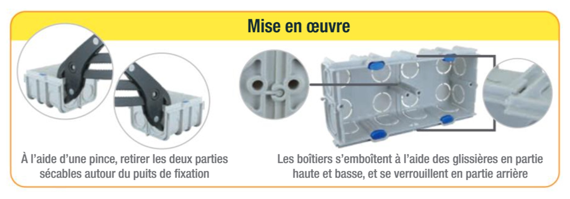Grâce à leur conception ingénieuse et leurs côtés sécables, ces boîtiers peuvent être juxtaposés pour créer des boîtiers multi-postes selon vos besoins.
