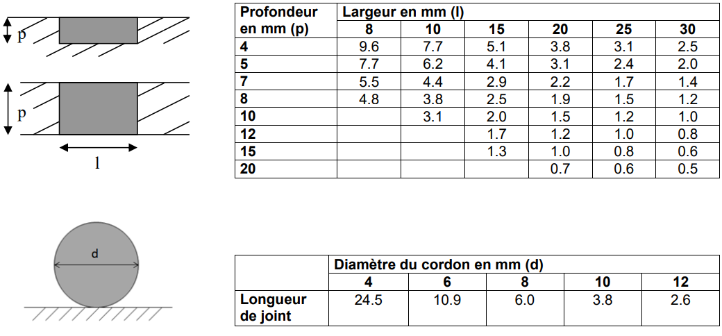 En fonction des dimensions du joint et de l’application, une cartouche de 310 ml permettra de réaliser un joint d'une longueur (la longueur du joint est exprimée en mètres).