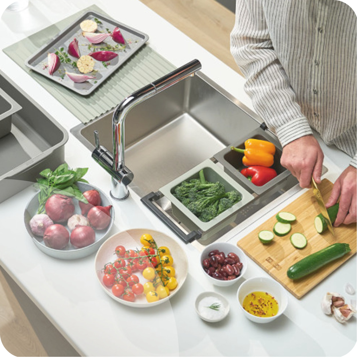 Anjou-Connectique, c’est aussi une large sélection de planches à découper pour évier de cuisine. Nos planches sont disponibles en différents matériaux : PVC, bois ou verre. La Planche à découper coulissante en verre - Franke 237522 est discrète et résistante. Pour un style plus chaleureux, optez pour des planches à découper en bois comme la Planche à découper PLAUNI Iroko qui chevauche tout évier de largeur minimum de 500mm. Enfin, pour gagner du temps dans la réalisation de vos recettes, équipez-vous de notre Seau inox BLANCO SOLON à intégrer dans le plan de travail pour une évacuation directe des déchets. Grâce à cet accessoire, plus besoin de se baisser ou de faire des allers-retours jusqu’à la poubelle !