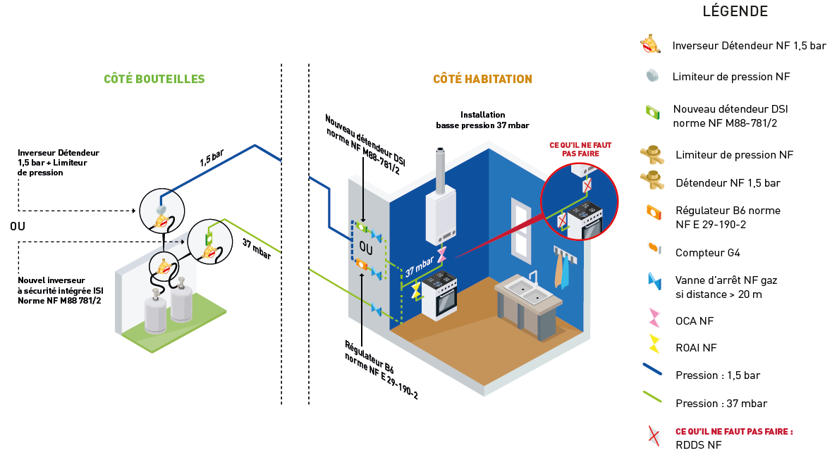 Schéma pratique pour l'installation du détendeur avec la nouvelle norme NF