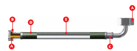 A : Laiton / B : EPDM / C : Acier inoxydable AISI 304 / D : Acier inoxydable tressé AISI 304 / E : EPDM
