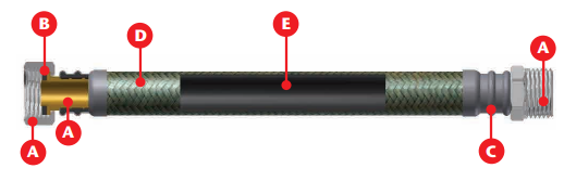 A : Laiton CW617N / B : EPDM / C : Acier inoxydable AISI 304 / D : Acier inoxydable tressé AISI 304 / E : EPDM