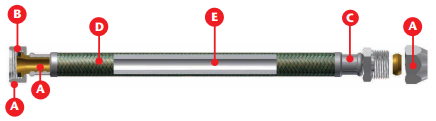 A : Laiton / B : EPDM / C : Acier inoxydable AISI 304 / D : Acier inoxydable AISI 304 tressé / E : EPDM