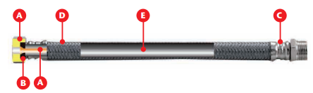 A : Laiton CW617N / B : Joint EPDM / C : Acier inoxydable AISI 304 / D : Tresse polymère / E : Tuyauterie EPDM