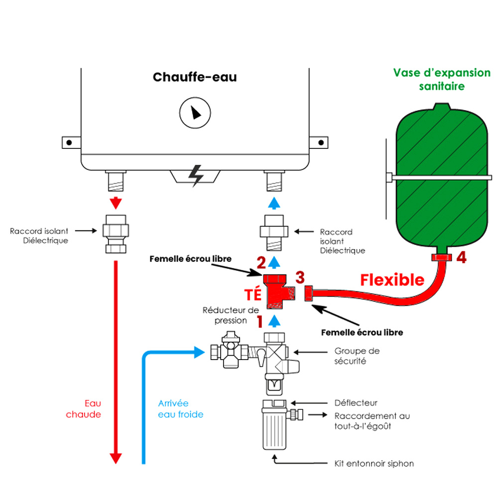 Raccordez simplement votre vase d'expansion de 5, 8, 12, 18 litres à votre chauffe-eau grâce au Té mâle/mâle 3/4" femelle écrou libre 3/4" et au flexible Inox 3/4" ACS.