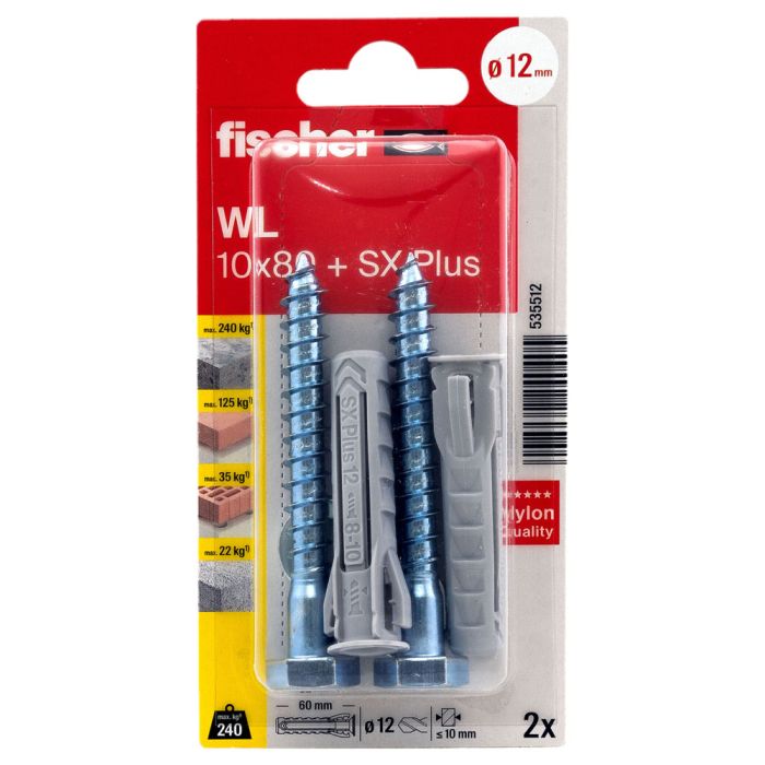 • Contenu : 2 chevilles SX Plus 12 + 2 vis à bois 10 x 80 DIN 571 + 2 rondelles