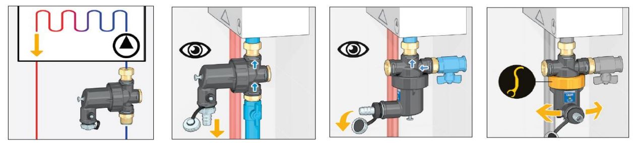 Les connexions filetées présentes sur le pot DIRTMAG MINI sont interchangeables et peuvent s'inverser du fait qu'elles sont à raccord rapide avec clip de fixation. Elles permettent d'installer facilement le pot de décantation en le tournant sur plusieurs positions selon la configuration hydraulique de l'installation.