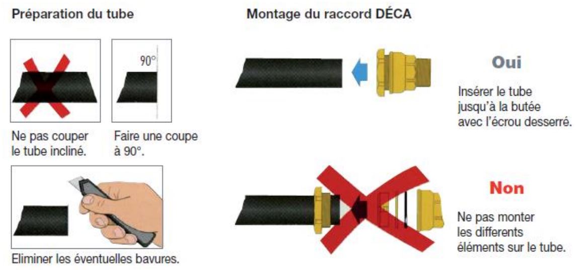 10. Insérer le tube dans le raccord DECA ( sans démonter ce dernier ) jusqu’à la butée de la chambre de pénétration afin de s’assurer que toute la périphérie du tube soit en contact avec le joint d’étanchéité.