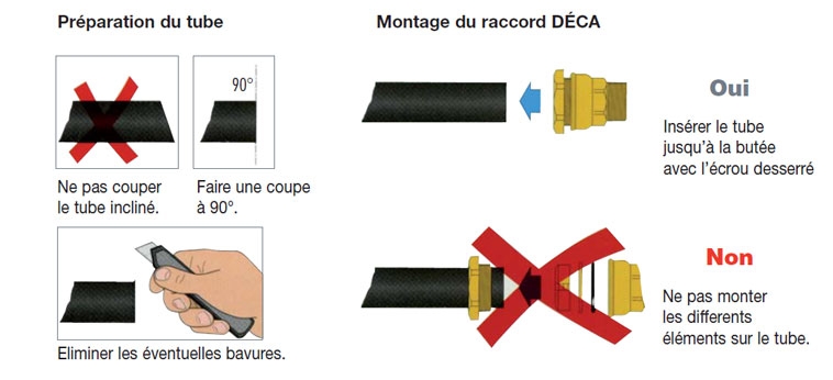 10. Insérer le tube dans le raccord DECA ( sans démonter ce dernier ) jusqu’à la butée de la chambre de pénétration afin de s’assurer que toute la périphérie du tube soit en contact avec le joint d’étanchéité