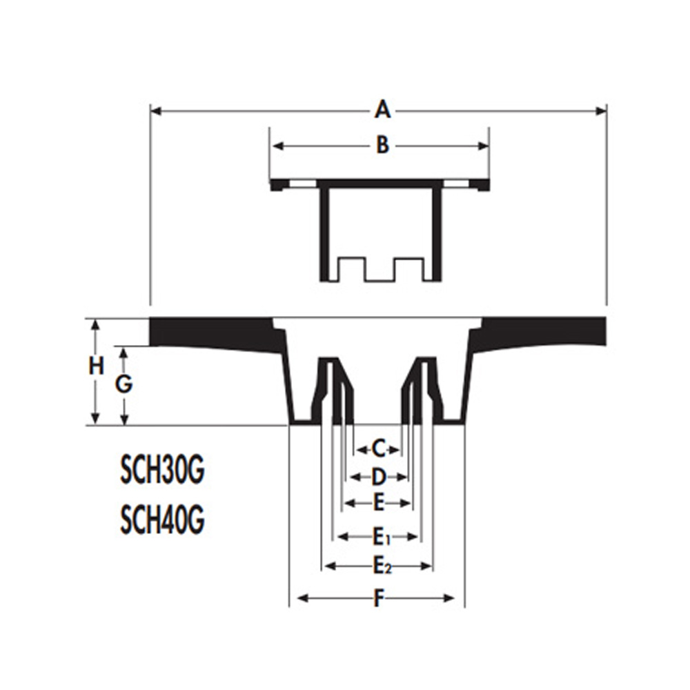 A : 385 mm / B : 210 mm / C : 80 mm / D : 90 mm / E : 100 mm / E1 : 110 mm / E2 : 125 mm / F : 185 mm / G : 90 mm / H : 115 mm