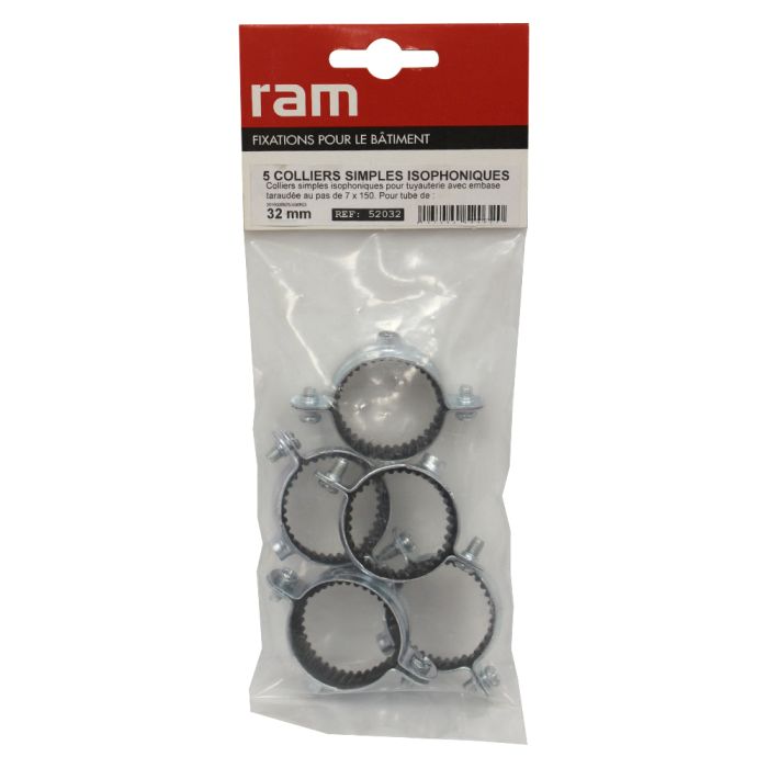 Sachet de 5 colliers simple isophonique métallique pour tube Ø32 - RAM