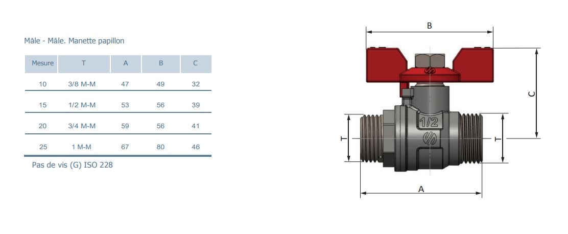 Vanne à sphère PN25 NILE ACS Manette Papillon rouge Mâle/Mâle 1/2"(15x21)